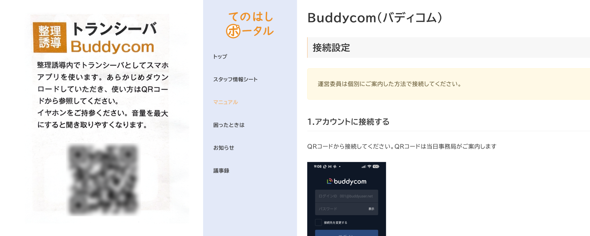 炊き出しには当日ボランティアで来てくださる方もいらっしゃいます。初めてBuddycomを使う方でも分かりやすいように、活動前のレクチャー時に配布する資料にBuddycom使い方ガイドのQRコードを添付しています。QRコードを読み込むと団体のポータルサイトに遷移し、アカウントのログイン方法からユーザー名の変更方法、発話の方法などを一通り確認することができます。