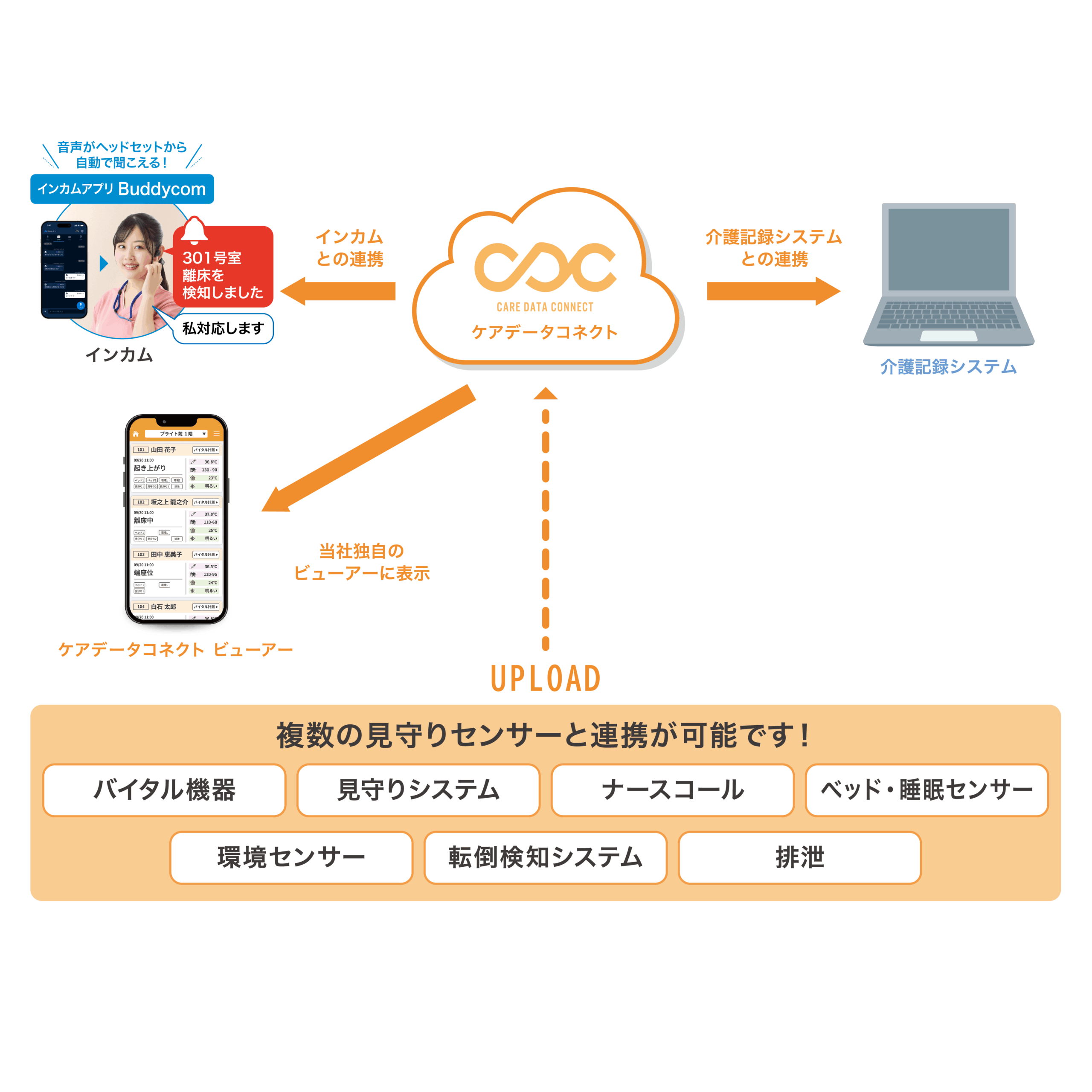 あらゆる見守りシステムの通知が「ケアデータコネクト」に集約され、「ケアデータコネクト」から「Buddycom」に通知されるため、音声通知を一本化できます。