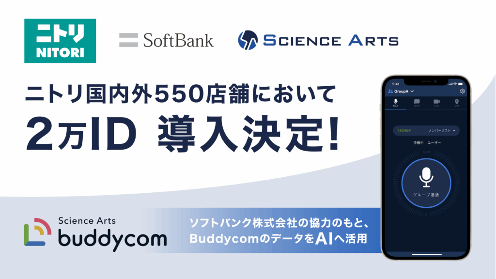 株式会社サイエンスアーツ(所在地:東京都渋谷区、代表取締役社長:平岡 秀一)が提供する、フロントラインワーカーをつなげるライブコミュニケーションプラットフォーム「Buddycom(バディコム)」を、株式会社ニトリ(本社:札幌市北区 代表取締役会長兼社長 似鳥 昭雄)の国内外550店舗において2万IDの導入が決定したことをお知らせします。