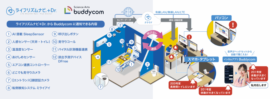 株式会社サイエンスアーツ(本社所在地:東京都渋谷区、代表取締役社長:平岡 秀一、 以下「サイエンスアーツ」)が提供するフロントラインワーカーをつなげるライブコミュニケーションプラットフォーム「Buddycom(バディコム)」は、エコナビスタ株式会社(本社所在地:東京都千代田区、代表取締役:渡邉 君人、杉嵜 将茂 以下「エコナビスタ」)の、睡眠解析技術をベースに開発したSaaS型高齢者見守りシステムのトップランナー※1のサービス「ライフリズムナビ」と連携したことをお知らせします。