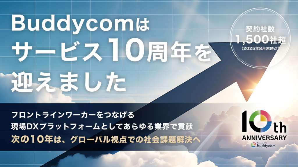 株式会社サイエンスアーツ(所在地:東京都渋谷区、代表取締役社長:平岡 秀一)は、フロントラインワーカーをつなげるライブコミュニケーションプラットフォーム「Buddycom(バディコム)」が、2025年9月にサービス開始から10周年を迎えたことをお知らせします。