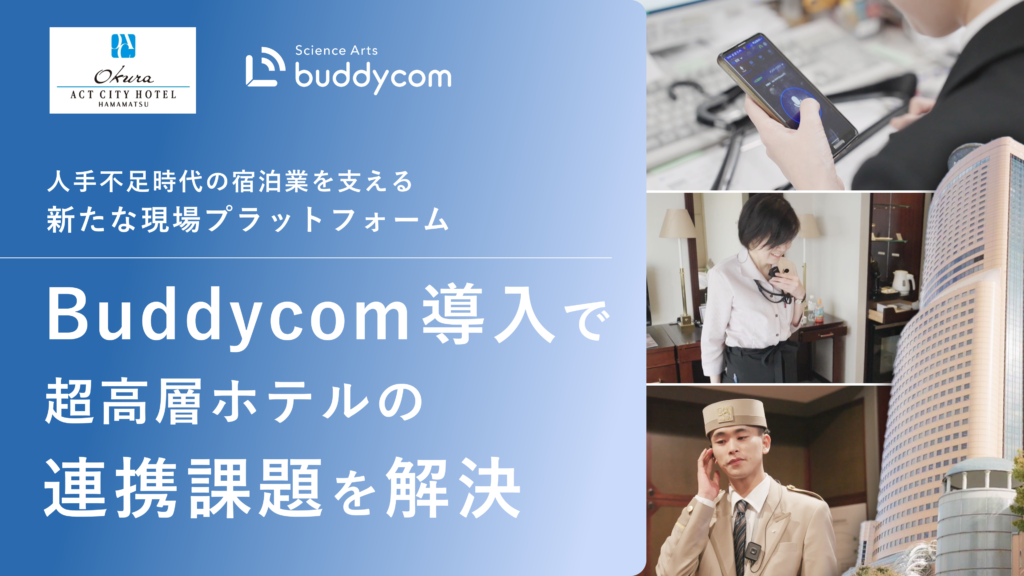 株式会社サイエンスアーツ(所在地:東京都渋谷区、代表取締役社長:平岡 竜太朗)は、オークラアクトシティホテル浜松(所在地:静岡県浜松市、運営:オークラアクトシティホテルマネジメント株式会社、代表取締役社長:似内隆晃)において、フロントラインワーカーをつなげるライブコミュニケーションプラットフォーム「Buddycom(バディコム)」が導入されたことをお知らせいたします。